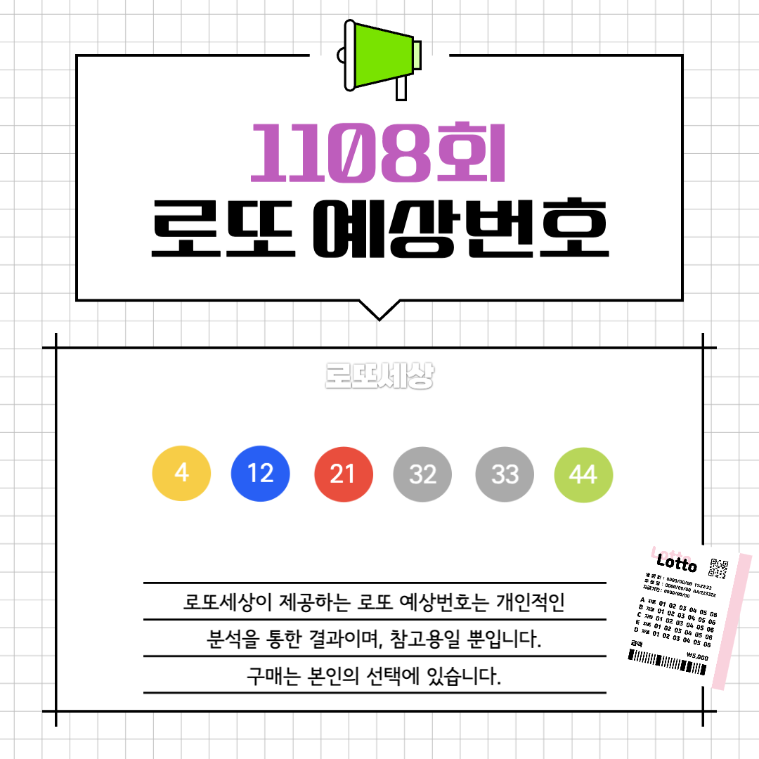 오늘은 이번주 1108회 로또 당첨번호에 대해서 살펴보겠습니다. 사람들은 희망과 기대를 안고 매주 수많은 사람들이 로또 복권에 도전합니다. 이번 글에서는 최근 5주간의 데이터를 바탕으로 한 1108회 로또 당첨번호 분석과 예상번호를 제공합니다. 일반적으로 로또 당첨은 100% 운이다고 말하지만, 통계적 분석으로 접근하면 조금의 당첨확률을 높일 수 있습니다.