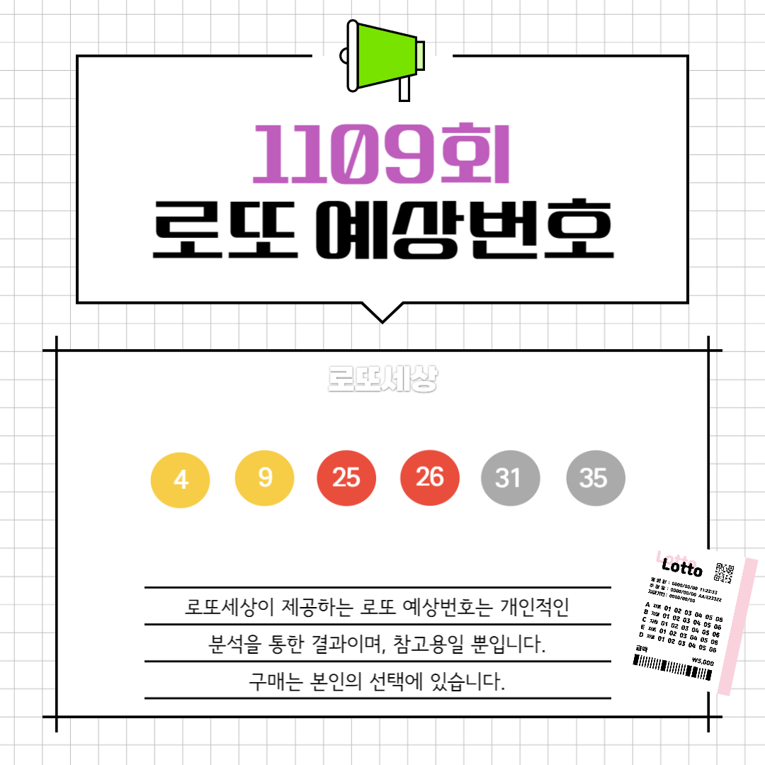 3월 2일에 발표될 1109회 로또 당첨번호는 어떤 번호들이 나올까요? 많은 사람들은 1등이 될 기대를 안고 매주 로또 복권을 구매합니다. 아래 글에서는 최근 5주간의 데이터를 기반으로, 1109회 로또 당첨번호 분석과 예상번호를 제공해 드립니다. 보통 로또 당첨은 100% 운이라고 말하지만, 통계적으로 접근하면 당첨확률을 높일 수 있습니다.